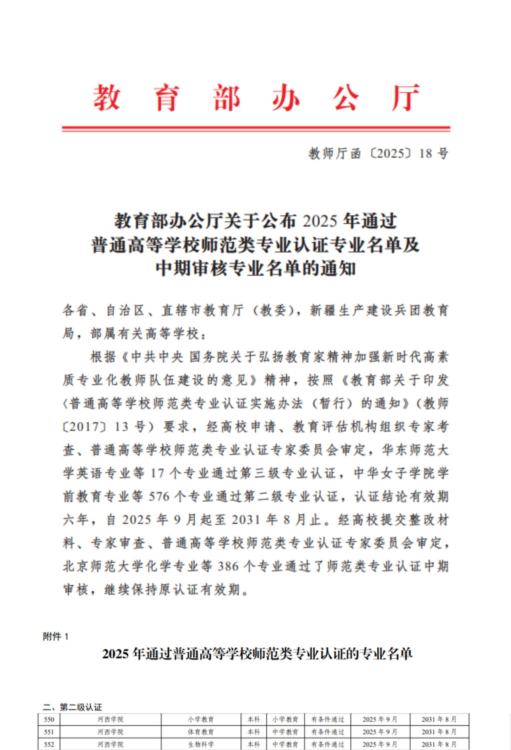 近日,教育部办公厅印发了《教育部办公厅关于公布2025年通过普通高等学校师范类专业认证及认证中期审核专业名单的通知》,公布了2025年通过普通高等学校师范类专业认证及中期审核的专业名单,我校小学教育、体育教育、生物科学3个专业顺利通过师范类专业中学教育第二级认证,认证结论有效期六年,自2025年9月起至2031年8月止。